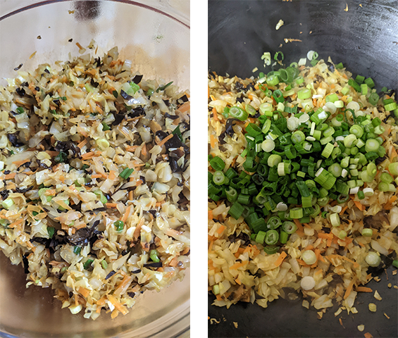 מכינים את המילוי – מחממים שמן בווק, מוסיפים שום וג'ינג'ר ומטגנים חצי דקה, מוסיפים כרוב, גזר ופטריות ומטגנים כ-5 דקות עד שהירקות מתרככים. מתבלים במלח, פלפל לבן ורוטב סויה ומערבבים היטב.