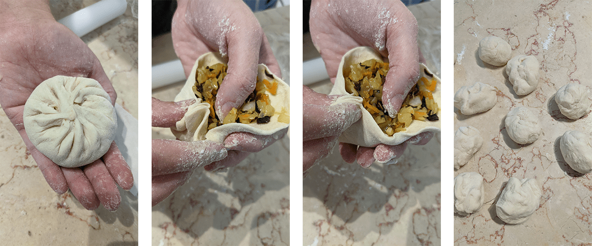 שמים שתי כפות מהמילוי במרכז העיגול ומתחילים לקפל את העיגול ע"י יצירת קפלים בבצק כאשר האגודל תמיד נשאר על הקפל הראשון. חוזרים על הפעולה עם שאר עיגולי הבצק.