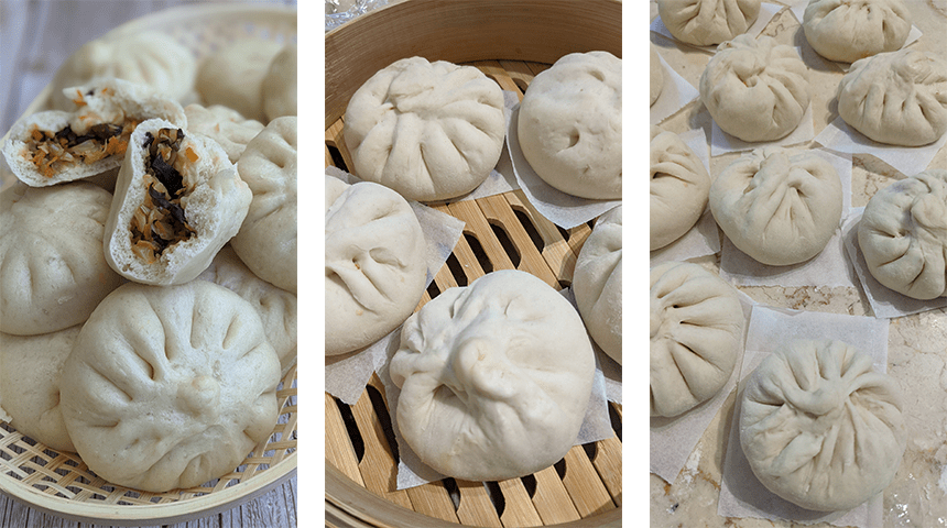 מוציאים את הלחמניות לצלחת וממשיכים לאדות את שאר הלחמניות באופן דומה. מגישים בליווי רוטב שעשוי מרוטב סויה מעורבב עם מעט חומץ שחור, אפשר גם להגיש עם שמן צ'ילי לאוהבי החריף.
