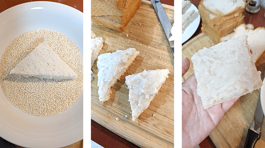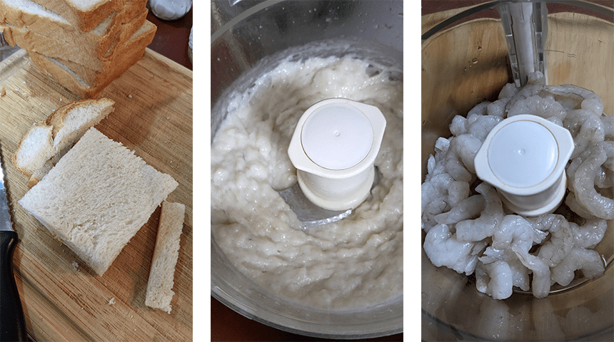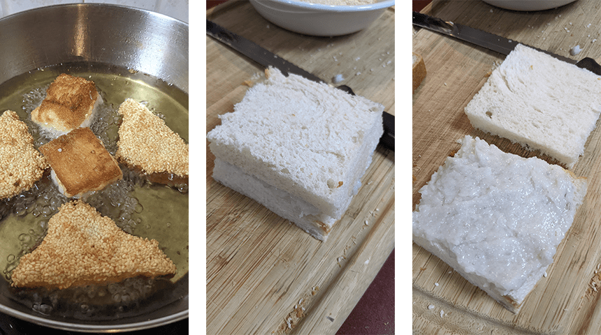 לטוסטים בסגנון קוריאני/יפני – מסירים את הקרום מכל צידי פרוסות הלחם. מורחים פרוסה בנדיבות בממרח השרימפס, סוגרים מעל עם פרוסה נוספת וחותכים את הסנדוויץ' ל-4 ריבועים קטנים. מטגנים את הריבועים עד להשחמה מכל הצדדים. מוציאים לרשת או למסננת.