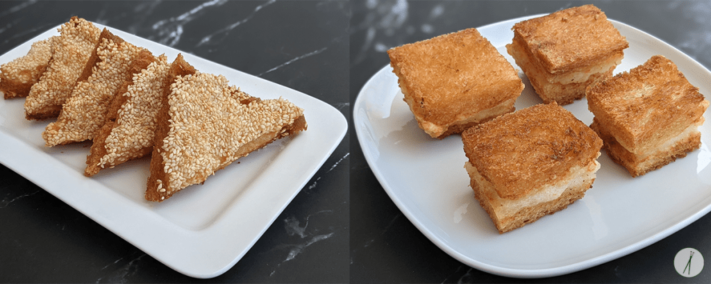 לטוסטים בסגנון סיני – מסירים את הקרום מכל צידי פרוסות הלחם. מורחים פרוסה בנדיבות בממרח השרימפס, חותכים את הפרוסה באלכסון ל-2 משולשים וטובלים את הצד עם ממרח השרימפס בשומשום. מטגנים את המשולשים כשהצד עם השומשום כלפי מטה עד להשחמה, הופכים ומטגנים גם את הצד השני. מוציאים לרשת או למסננת.
