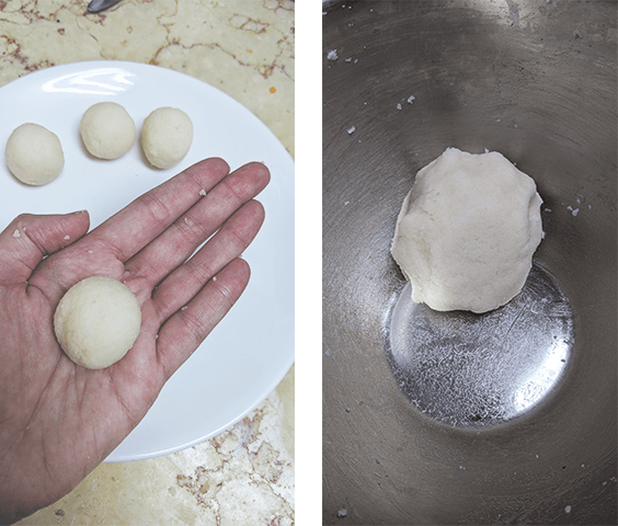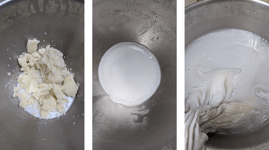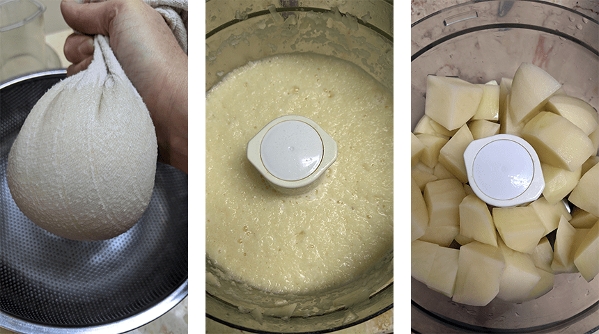 בקערה גדולה שמים כ-3 כוסות מים, משקיעים את הצרור במים ומעסים אותו כך שהעמילן שבתפוחי האדמה יישטף לתוך המים שבקערה. סוחטים היטב את הצרור עד שלא נותרים בו מים. נותנים למים עם העמילן לעמוד כ-15 דק' עד שכל העמילן שוקע לתחתית הקערה. מרוקנים בזהירות את המים ומעבירים את תפוחי האדמה הסחוטים לקערה עם העמילן, מוסיפים חצי כפית מלח ומאחדים למעין בצק. יוצרים כדורים קטנים בקוטר 4 ס"מ ומניחים בצד.