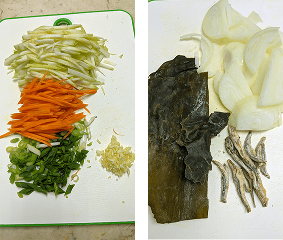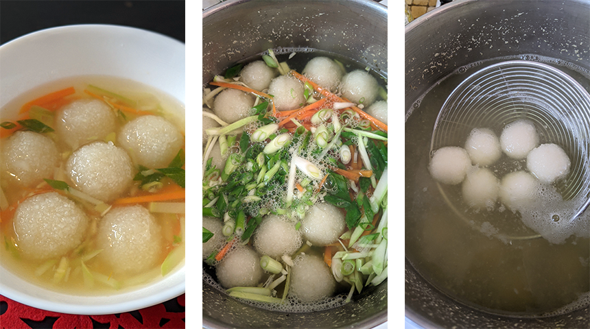 מכינים את הציר – בסיר שמים מים, אנשובי ואצת קומבו. מביאים לרתיחה ומוציאים את אצת הקומבו. מבשלים ברתיחה עוד כ-10 דקות ומוציאים את האנשובי. מתבלים ברוטב סויה ומעט מלח ומכניסים את הכדורים לסיר אחד אחד, מערבבים ומביאים שוב לרתיחה. כשהכדורים צפים מכניסים את הירקות החתוכים ואת השום הכתוש. מבשלים עוד כ-5 דקות עד שהירקות רכים, טועמים ומוסיפים מלח ופלפל שחור לפי הטעם.