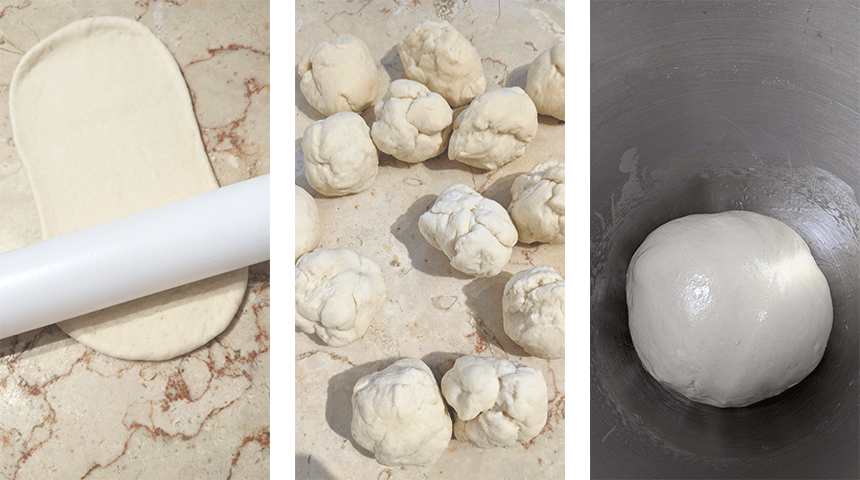 מכינים את הבצק – בקערה גדולה שמים קמח, מלח, סוכר ושמרים ומערבבים קלות. מוסיפים מים בהדרגה תוך כדי ערבוב עד שכל הקמח נספג ומתאחד לבצק שלא נדבק לידיים ולדפנות הקערה. לשים את הבצק כ-5 דקות, מכסים בניילון נצמד ומניחים ל-10 דק' מנוחה. לאחר המנוחה לשים מעט עד שהבצק חלק ואחיד, מכסים ומניחים ל-10 דק' נוספות.