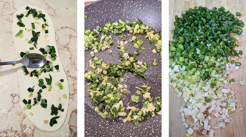 להכנת המילוי מחממים 2 כפות שמן במחבת, מוסיפים את הבצל הירוק והמלח. מטגנים כשתי דקות עד שהבצל מתרכך מעט, מסירים מהאש ומצננים.