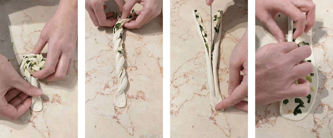 חותכים את הגליל לאורכו לשני חלקים אך לא עד הסוף, משאירים אותם מחוברים בקצה המשוטח. מלפפים את שני החלקים אחד מסביב לשני כמו בורג. מגלגלים את הבורג סביב עצמו עד שמגיעים לקצה השטוח ומתקבלת צורה של פרח, מכניסים את החלק השטוח מתחת לפרח ומניחים על ריבוע נייר אפייה. חוזרים על הפעולות עם שאר כדורי הבצק.