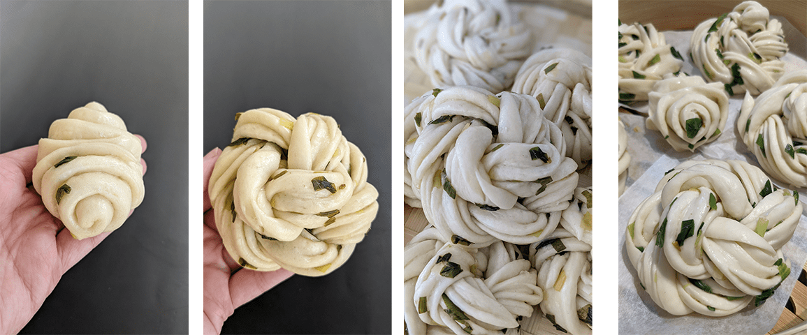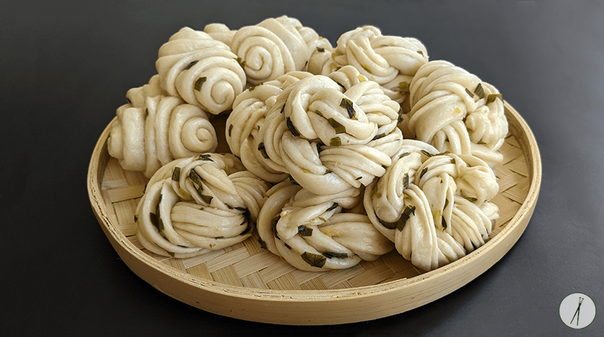 לחמניות פרח בצל ירוק, Huājuǎn. לחמניות מאודות סיניות רכות בעלות טעם בצלי עדין המוגשות לרוב לארוחת בוקר. ישנן מספר צורות לקיפול הלחמניות כשהדגש הוא על יצירת שכבות דקות של בצק כשבינהן מציץ הבצל הירוק, מה שנותן להם צורה דמויית פרח ומכאן גם השם שלהן.