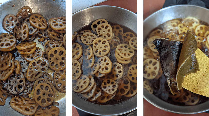 מסננים את פרוסות הלוטוס ממי המלח, שוטפים היטב ומניחים במסננת לייבוש. במחבת עמוקה או סיר רחב מחממים שמן, מוסיפים את פרוסות הלוטוס ומטגנים מעט. מוסיפים אצת קומבו, סוכר חום, מירין, 2 כפות סירופ תירס, רוטב סויה ומים ומביאים לרתיחה תוך כדי ערבוב.