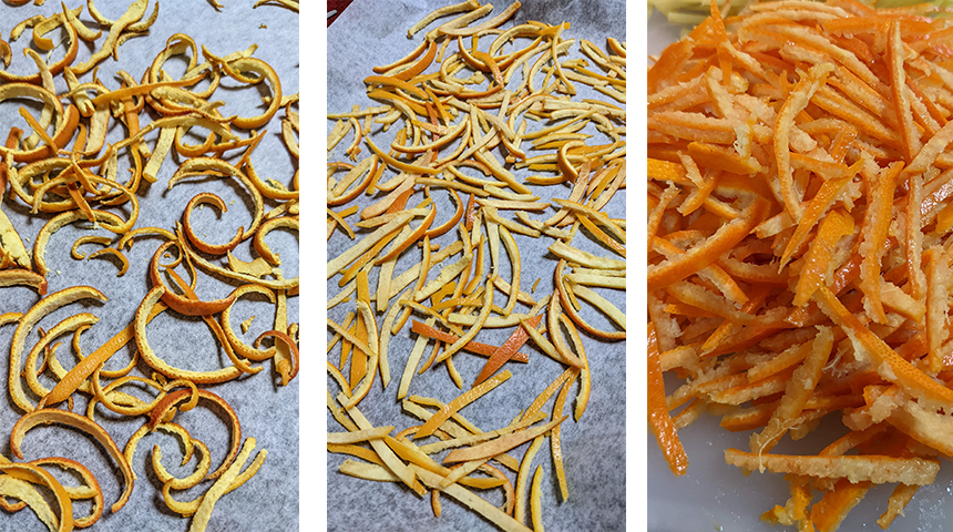 חותכים את הקליפות לרצועות דקות ומניחים בשכבה אחת בתבנית תנור מרופדת בנייר אפייה. מכניסים לתנור ואופים 45 דקות עד שהקליפות מצומקות ומסולסלות, מוציאים מהתנור ומצננים.