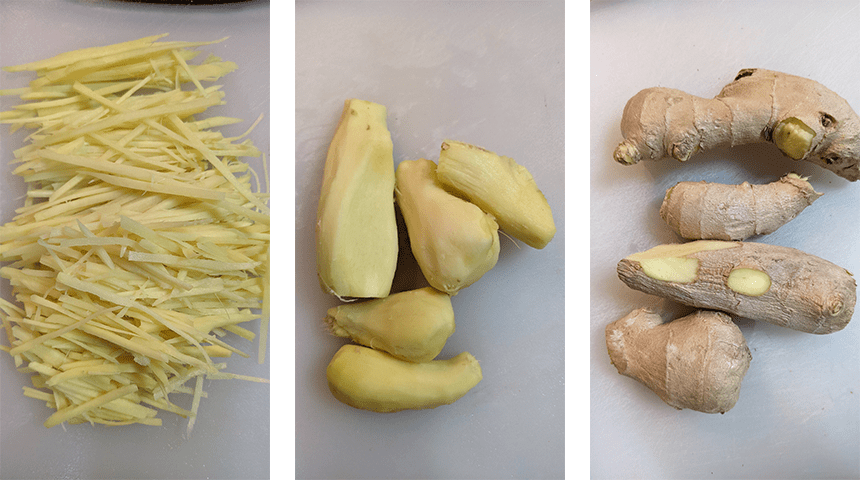 מקלפים את שורש הג'ינג'ר וחותכים לגפרורים דקים.