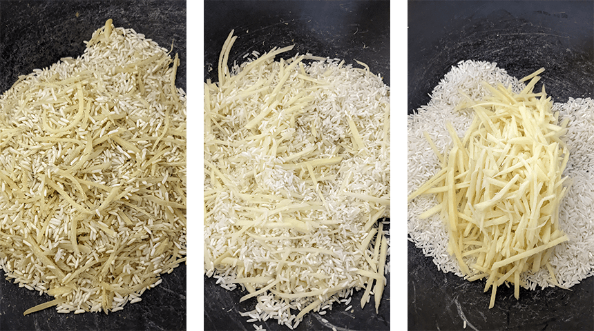 מחממים ווק על אש גבוהה ומוסיפים את האורז. מחממים את האורז תוך כדי ערבוב עד שהוא יבש לחלוטין. מוסיפים את הג'ינג'ר ומערבבים כ-5 דקות עד שהאורז מתחיל לשנות את צבעו לזהוב