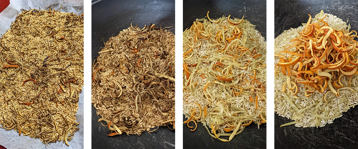 מוסיפים את קליפות הקלמנטינה וממשיכים לערבב עד שהאורז שחום והג'ינג'ר יבש לחלוטין. מפזרים את תערובת האורז על תבנית מרופדת בנייר אפייה (אפשר באותה התבנית שהיו בה הקליפות), ומניחים לצינון מוחלט. מעבירים לצנצנת אטומה ושומרים במקום קריר וחשוך מחוץ למקרר.