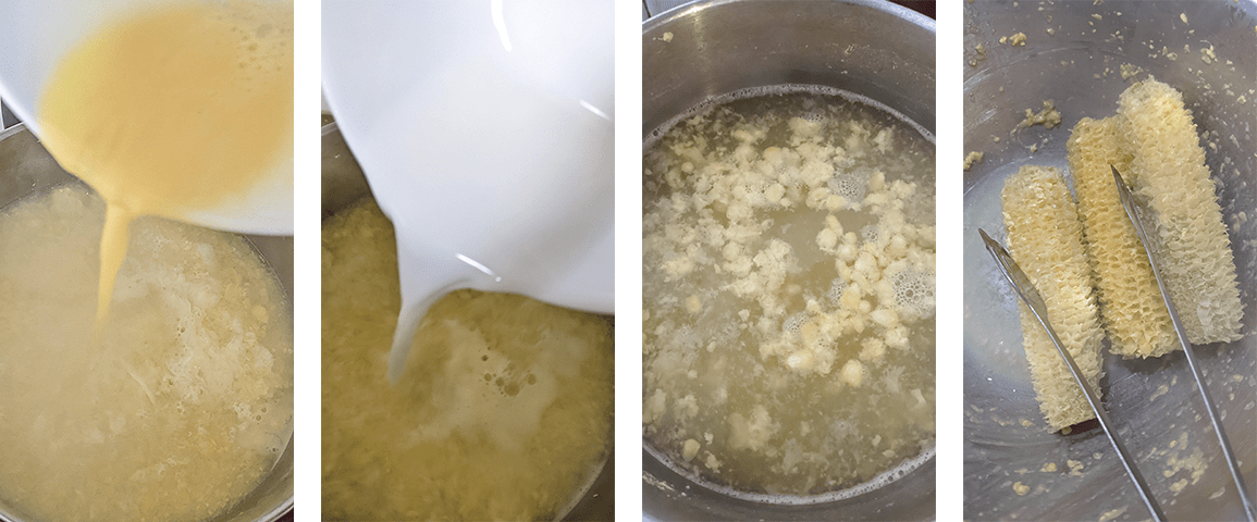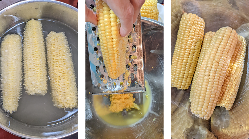 על פומפיה עם חורים גדולים מגררים 3 קלחי תירס לתוך קערה. מניחים את הקלחים הריקים בסיר עם מים ומרתיחים כ-15 דקות.