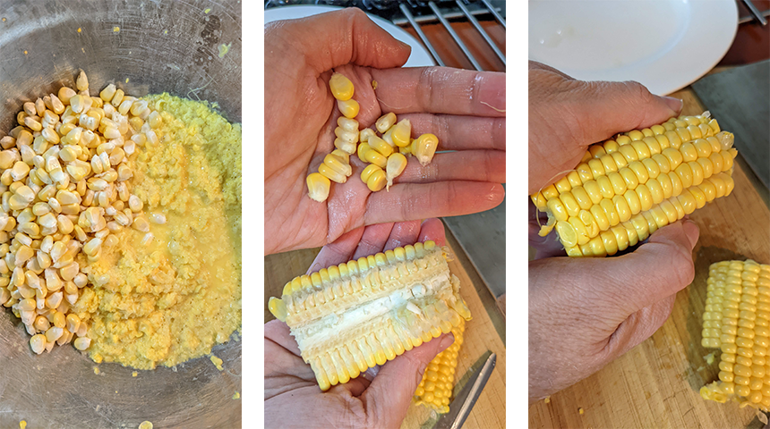 מפרידים את גרעיני התירס מהקלח הרביעי – חותכים את הקלח לשניים, מחדירים מספריים במרכז כל חצי קלח ומסובבים בעדינות עד שהקלח מתבקע לאורכו לשני חצאים וכך ניתן להסיר את הגרעינים בקלות. מוסיפים לקערה עם התירס המגורר.