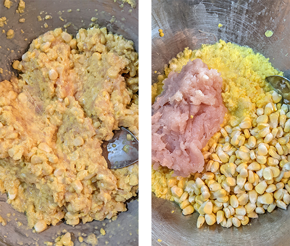 מוסיפים את משחת העוף לקערה עם התירס ומערבבים היטב לתערובת אחידה.