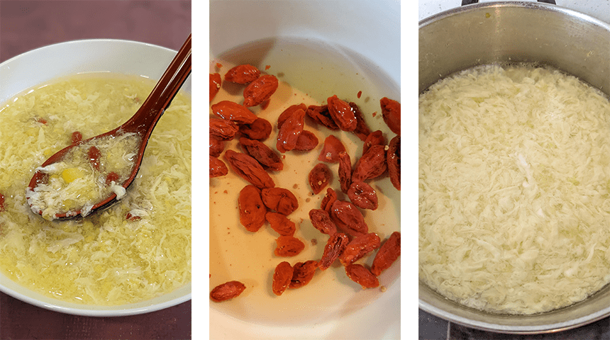פותחים את מכסה הסיר ומוסיפים את קמח הטפיוקה המדולל, מערבבים ומבשלים כשתי דקות עד שהמרק מסמיך. מוזגים את הביצים הטרופות בזרם דק למרק תוך כדי ערבוב ליצירת נטיפי ביצים, מבשלים עוד דקה ומסירים מהאש.