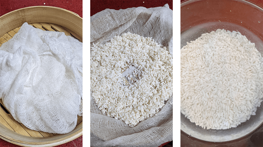 מרפדים סלסלת אידוי בבד גבינה רטוב, מניחים את האורז על הבד, משטחים ויוצרים חור במרכז בצורה המזכירה טבעת. מכסים את האורז בשארית הבד, סוגרים את המכסה ומאדים מעל מים רותחים 25 דקות.
