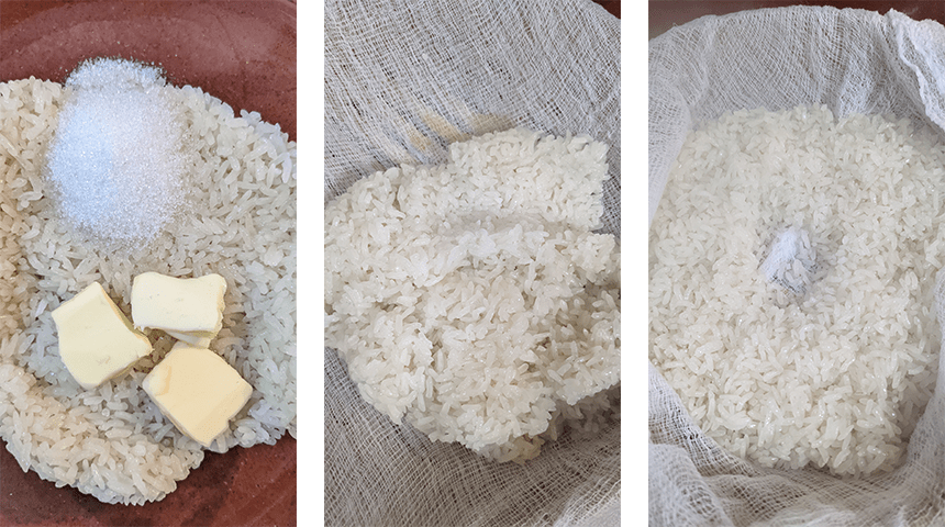 מעבירים את האורז המבושל לקערה, מוסיפים חמאה וסוכר ומערבבים עד שהחמאה נטמעת לחלוטין באורז.