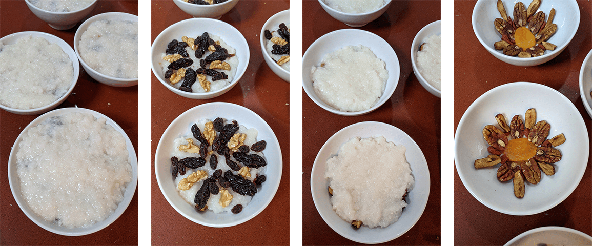 משמנים שתי קעריות חסינות חום. מסדרים את הפירות היבשים בצורה נאה בתחתית כל קערית, ממלאים מחצית מגובה הקערית באורז ומהדקים היטב. מפזרים על האורז פירות יבשים באופן חופשי ומכסים עד שפת הקערה באורז. מכסים בניילון נצמד ומהדקים היטב.