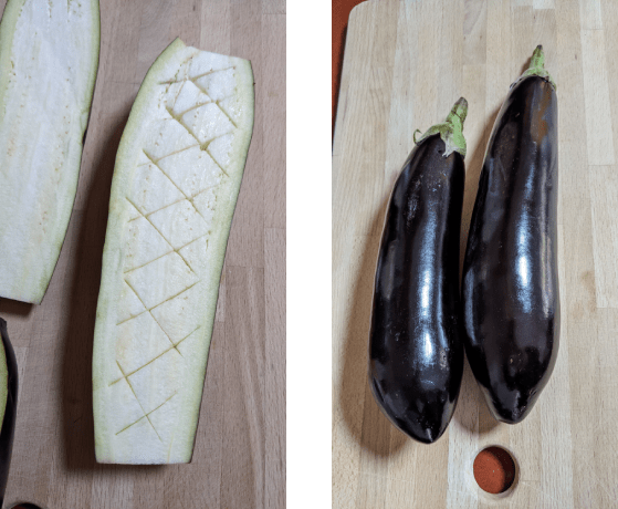 חורצים את בשר החצילים באלכסון עם מרווח של 2 ס"מ בין החריצים, מסובבים וחורצים בצורה דומה לכיוון הנגדי כך שמתקבלת דוגמת מעוינים. החריצים צריכים להיות עמוקים אך לא עד הסוף כך שחצאי החציל ישארו שלמים.