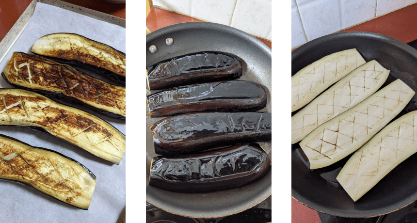 מחממים מעט שמן במחבת ומניחים את חצאי החצילים כשהקליפה כלפי מטה. מטגנים כ-3 דקות עד שהקליפה משחימה מעט, הופכים את החצילים, סוגרים עם מכסה ומטגנים 5 דקות. הופכים שוב את החצילים, סוגרים עם המכסה ומטגנים 5 דקות נוספות עד שהחצילים מתרככים. מוציאים ומניחים על תבנית מרופדת בנייר אפייה.