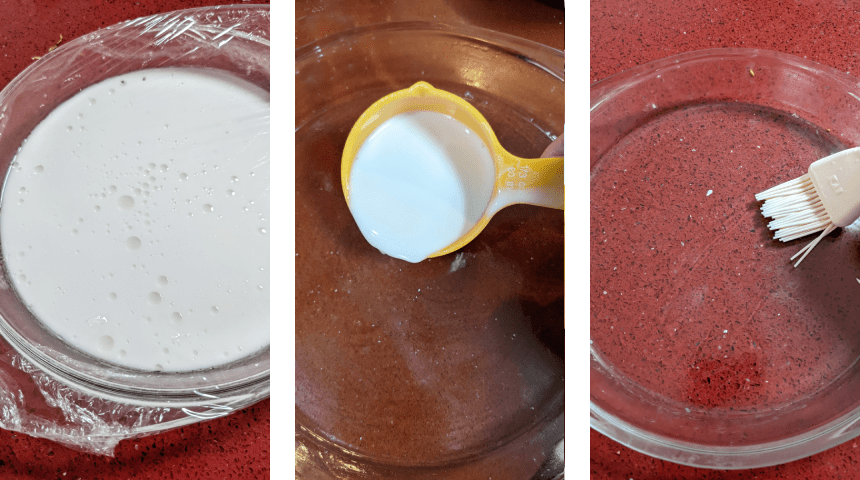 משמנים כלי מתאים לשימוש במיקרוגל בקוטר 18-20 ס"מ, מערבבים את התערובת לאיחוד ומוזגים ¼ כוס לכלי המשומן, מנענעים מעט את הכלי כך שהתערובת תכסה את התחתית בשיכבה דקה ואחידה. מכסים במכסה תואם או בניילון נצמד מחורר.