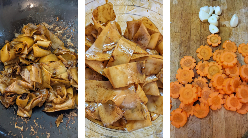 מכינים את הירקות – קוצצים דק את השום, חותכים את עלי החסה ל-2-3 חלקים ופורסים את הגזר לפרוסות בעובי חצי ס"מ, אם רוצים אפשר לחרוץ חריצים מסביב לגזר כך שבזמן הפריסה יתקבלו פרוסות בצורת פרח.