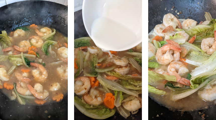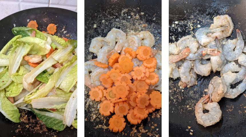 מוסיפים שתי כפות שמן לווק, מוסיפים שום קצוץ ומטגנים מעט, מוסיפים את השרימפס ומערבבים עד שהוא משנה את צבעו. מוסיפים גזר ומטגנים כדקה, מוסיפים חסה ומערבבים עד שהיא מאבדת מעט מנפחה.