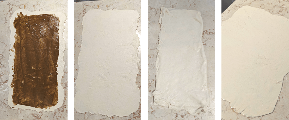 מוציאים את הבצק למשטח עבודה, מרדדים למלבן דק ובעזרת מברשת טבולה בשמן משמנים את כל שטח המלבן. מקפלים את המלבן שליש על שליש ומרדדים לעובי של 3 מ"מ.