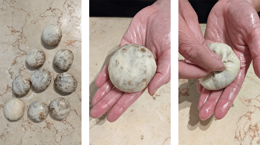מורחים את תערובת הטחינה באופן אחיד על מלבן הבצק, משאירים שוליים של 2 ס"מ מסביב. מגלגלים את הבצק לרולדה באופן הדוק ככל הניתן וחותכים ל-10 יחידות. מועכים מעט את הקצוות של כל חתיכה, מקפלים כלפי המרכז ומעגלים לכדור.