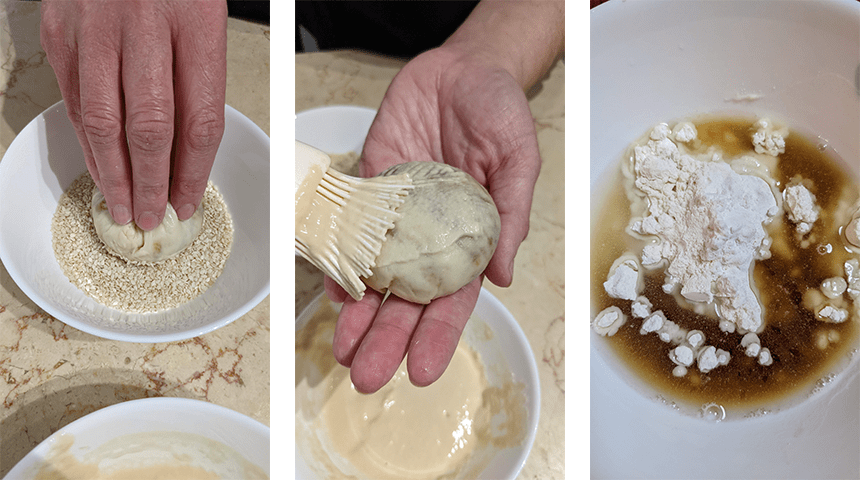 בקערית נקייה מערבבים קמח, רוטב סויה ומים. מורחים את התערובת על פני כל לחמנייה וטובלים אותה בשומשום.