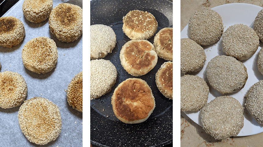 מטגנים את הלחמניות במעט שמן על אש בינונית-נמוכה כשצד השומשום פונה כלפי מעלה כ-4 דקות עד שהתחתית מזהיבה, הופכים ומטגנים את הצד השני עד להזהבה. מעבירים את הלחמניות לתבנית תנור מרופדת בנייר אפייה ואופים 6-8 דקות.