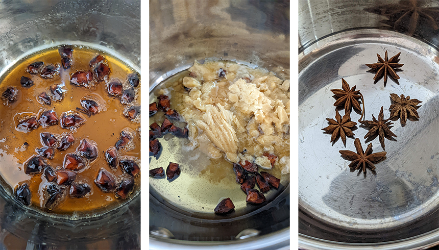 שוברים את כוכבי האניס לחתיכות ושמים בקלחת יחד עם סוכר דקלים ומים. מניחים את הקלחת על אש בינונית, מביאים לרתיחה ומבשלים תוך כדי ערבוב 5-6 דקות עד שצבע הסוכר הופך לצבע קרמל עמוק.