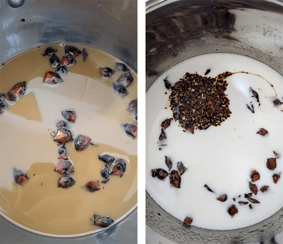 מורידים מהאש ומוסיפים חלב מרוכז, חלב קוקוס וקפה. מחזירים לאש ומחממים על אש נמוכה תוך כדי ערבוב עד לסף רתיחה.