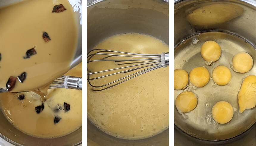 טורפים ביצים בקערה, מוסיפים תמצית וניל ואת תערובת חלב הקוקוס ומערבבים היטב. מניחים מסננת על הקלחת שבה היה חלב הקוקוס ומסננים את התערובת לתוך הסיר, נפטרים מחלקי האניס ומניחים את המסננת על הקערה, מסננים את התערובת שנית לתוך הקערה.
