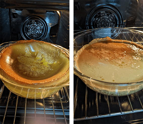 מכניסים תבנית אפייה לא מתפרקת לתנור לכ-15 דקות, מוציאים ושמים חמאה, מנענעים מעט את התבנית כך שהחמאה תצפה את תחתית התבנית. שופכים את התערובת המסוננת לתבנית, מחזירים לתנור ומורידים את החום ל-150 מעלות. אופים 40-50 דקות עד שסכין המוחדר למרכז הפלאן יוצא נקי.