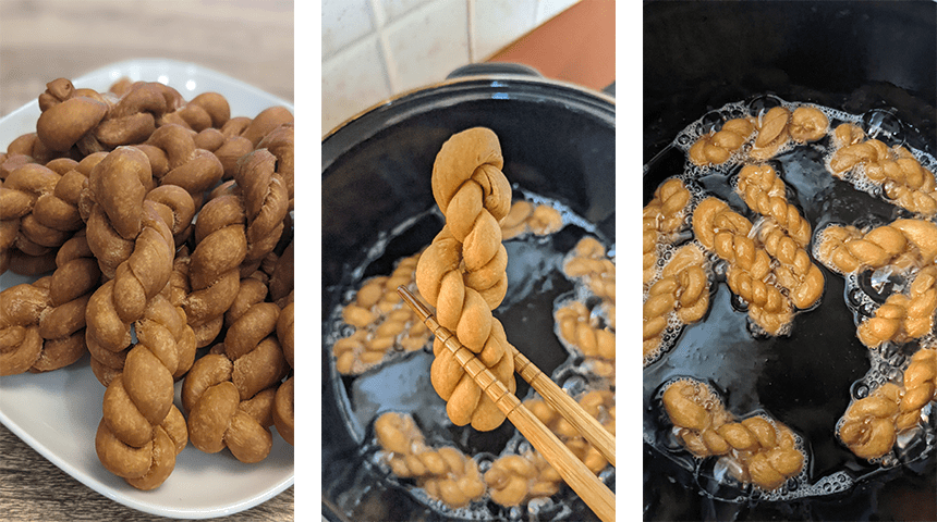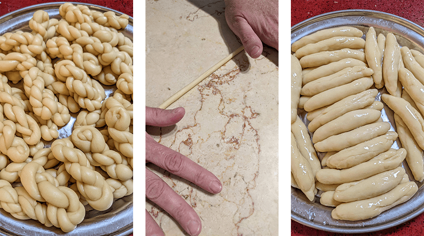 מגלגלים כל רצועה לגליל דק וארוך בעובי 3-4 מ"מ, מניחים את כפות הידיים בשני קצוות הגליל ומגלגלים לכיוונים מנוגדים, מרימים את שני הקצוות ומצמידים אחד לשני כך שהגליל מתלפף סביב עצמו לצורת בורג, חוזרים שוב על פעולת הגלגול וההרמה כך שהבורג מתלפף סביב עצמו. תוחבים את הקצוות בתוך הלולאה שנוצרה בקצה השני של הבורג (ראו וידאו להמחשה). חוזרים על הפעולות עם שאר הבצק.