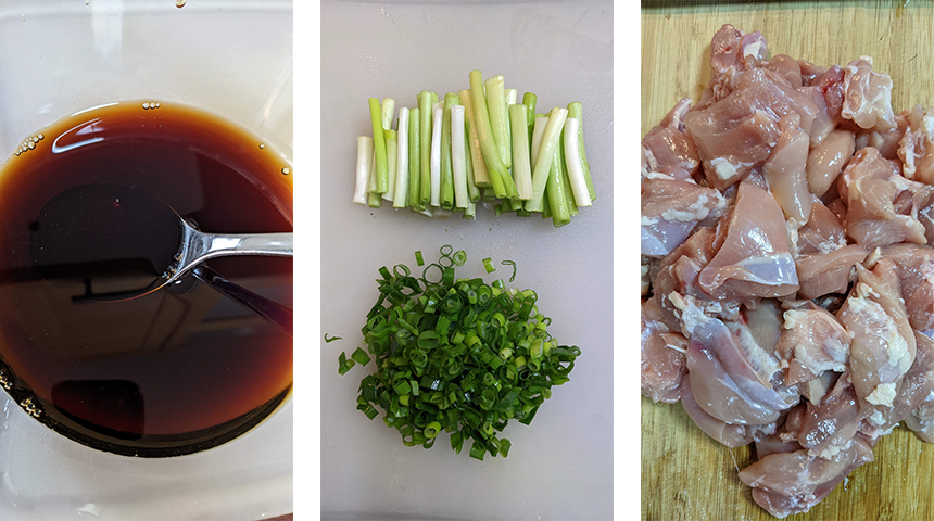 חותכים את הפרגיות לקוביות. מפרידים את הבצל הירוק לחלקים לבנים וירוקים. את החלקים הלבנים חותכים למקטעים באורך 4 ס"מ ואת החלקים הירוקים קוצצים ושומרים להגשה.