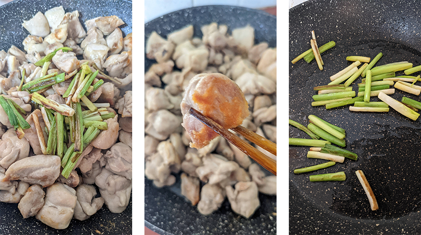 במחבת גדולה מחממים מעט שמן, מטגנים את החלקים הלבנים של הבצל הירוק עד להשחמה קלה ומוציאים לצלחת. מוסיפים למחבת את הפרגיות, מטגנים עד להשחמה ומחזירים את הבצל .
