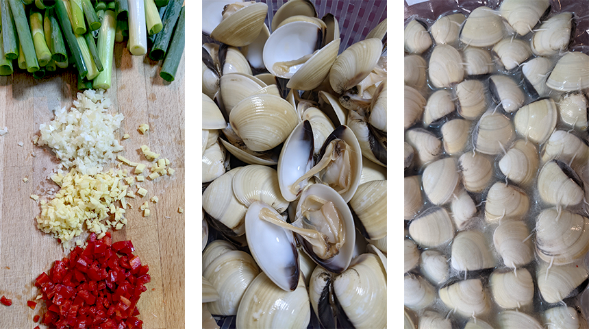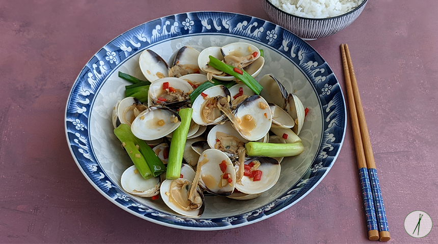 צדפות מוקפצות בג'ינג'ר ובצל ירוק – Cōng jiāng há. מנה סינית ריחנית ופשוטה להכנה של צדפות קטנות ברוטב של שום, ג'ינג'ר, צ'ילי ובצל ירוק. אפשר למצוא בארץ צדפות קפואות מבושלות, אם במקרה מוצאים צדפות חיות כדאי להשרות אותן במים עם מלח על מנת להיפטר מהחול שבפנים ולבשל אותן לפני שמקפיצים עם הרוטב. אם ישנן צדפות שנשארו סגורות לאחר הבישול נפטרים מהן.
