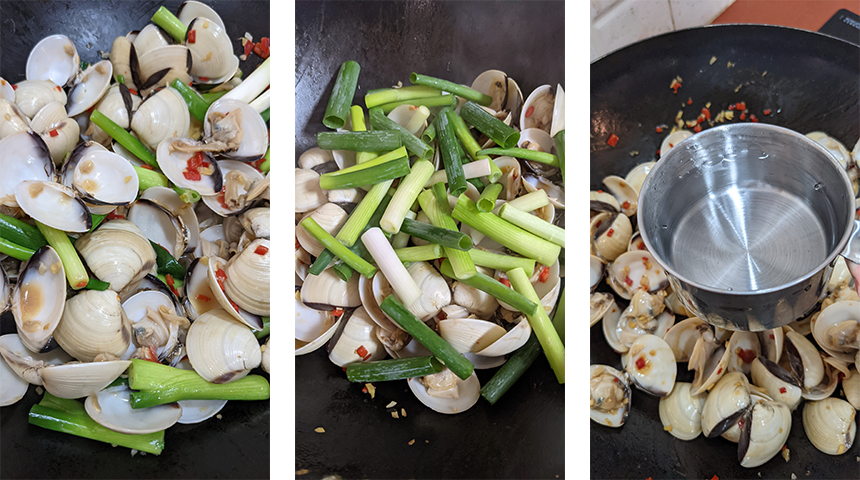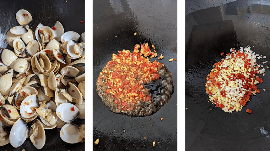 מחממים שמן בווק על אש גבוהה. מוסיפים שום, ג'ינג'ר וצ'ילי ומטגנים חצי דקה. מוסיפים רוטב סויה ורוטב צדפות ומערבבים. מוסיפים את הצדפות ומקפיצים כדקה עד שהן מכוסות ברוטב.