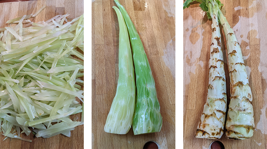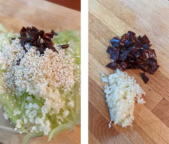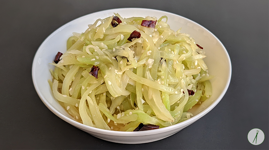 סלט אספרגוס סיני (חסה אספרגוס) – Liángbàn wōsǔn sī. סלט קליל ופיקנטי של אספרגוס סיני חתוך לגפרורים עם הרבה שום. אספרגוס סיני נקרא גם חסה אספרגוס והוא באמת נראה כמו הלב של החסה לאחר שמורידים ממנה את כל העלים, רק הרבה יותר גדול. הטעם של האספרגוס הסיני מעט מריר ובהחלט מזכיר חסה, מהמרירות נפטרים ע"י השרייה במלח. הסלט קל מאוד להכנה ונהדר בתור תוספת ירק מעניינת ומיוחדת לארוחה.