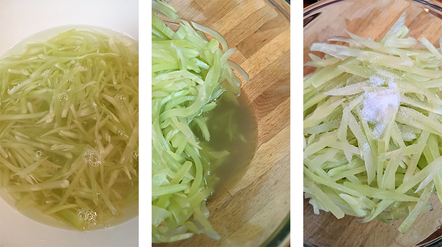 מעבירים לקערה ומפזרים מלח, מעסים היטב את המלח לתוך האספרגוס ומשהים כרבע שעה עד שהוא מגיר נוזלים. שוטפים בהרבה מים, מסננים ומעבירים לקערה נקייה.