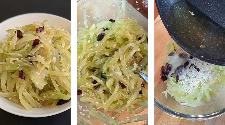 בסיר או מחבת קטנה מחממים שמן עד שהוא מתחיל להעלות עשן ושופכים לקערה על השום, הצ'ילי והשומשום. השמן החם עוזר לשחרר את הטעמים מהתבלינים.
