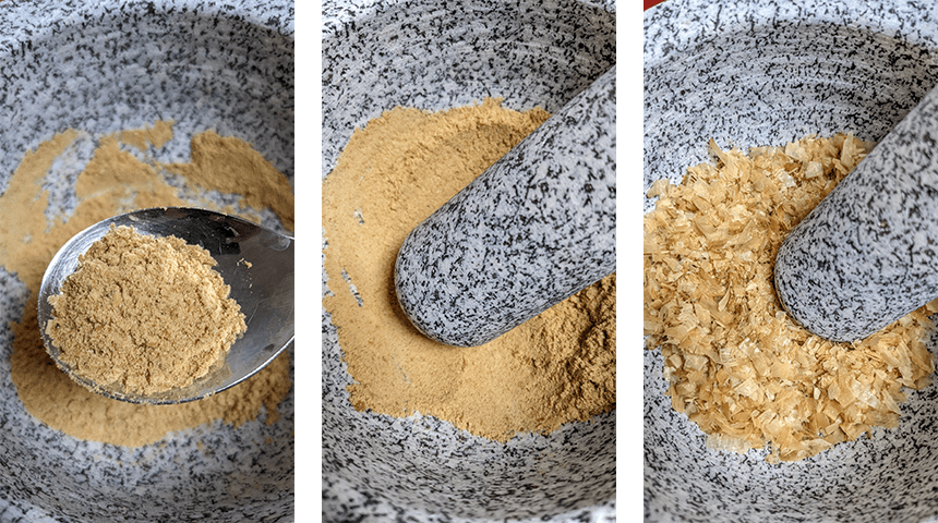 מכינים אבקת דגים – בעזרת מכתש ועלי או בלנדר טוחנים את שבבי הבוניטו לאבקה. מעבירים לקערית ומניחים בצד.