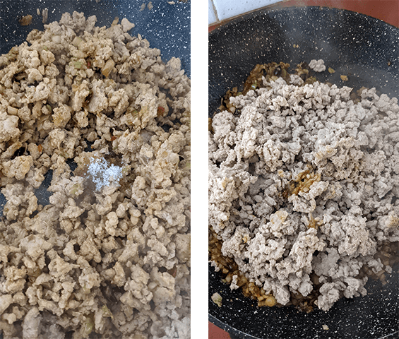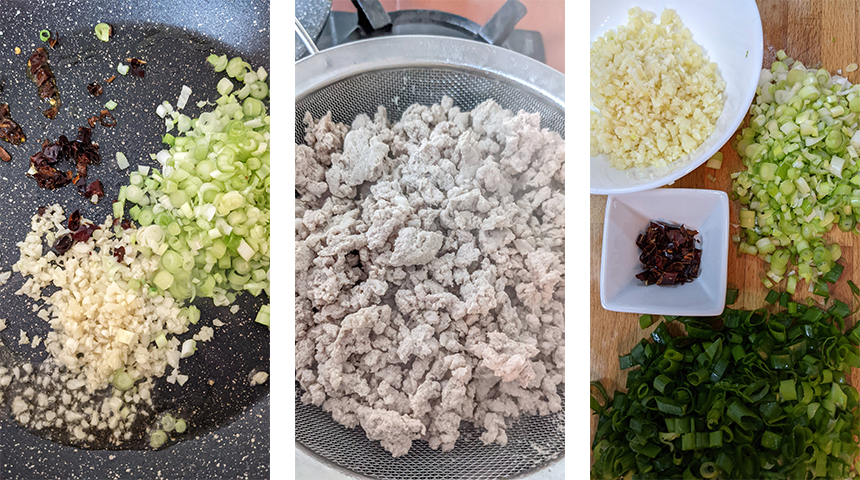 מכינים את הבשר – קוצצים שום ופלפל צ'ילי יבש. מפרידים בצל ירוק לחלקים לבנים וחלקים ירוקים וקוצצים דק, את החלקים הירוקים נשמור להגשה. מרתיחים מים בסיר ומוסיפים את הבשר הטחון. מביאים שוב לרתיחה ומסננים. מחממים שתי כפות מהשמן המתובל בווק, מוסיפים שום, צ'ילי יבש ואת החלקים הלבנים של הבצל הירוק ומטגנים חצי דקה.