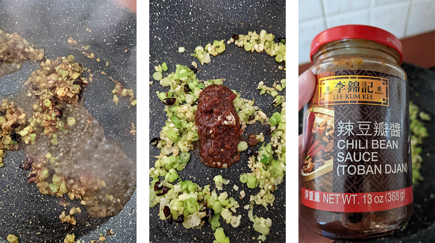 מוסיפים מחית סויה וצ'ילי (דו-באן-ג'יאנג) ומערבבים. מוסיפים יין בישול סיני ואת הבשר ומערבבים היטב. מוסיפים רוטב סויה וסוכר, מערבבים עוד כדקה ומסירים מהאש.