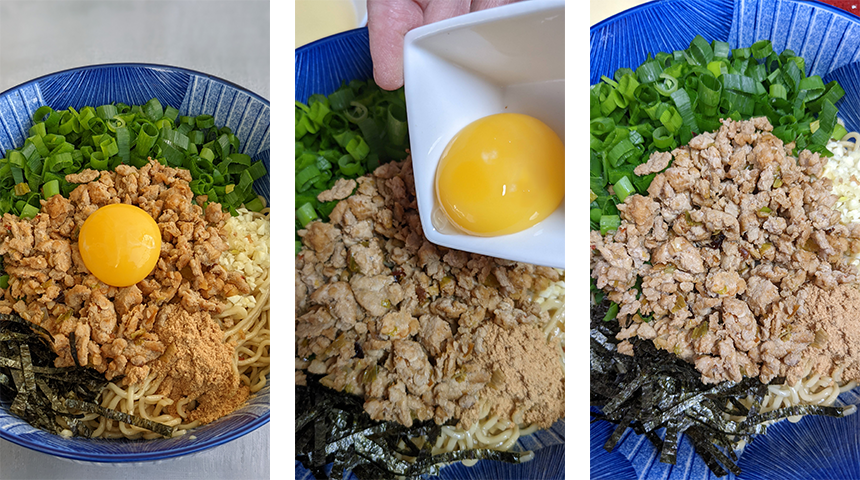 מניחים מעל האטריות חופן בצל ירוק קצוץ, חופן אצות נורי, מעט שום קצוץ וכף אבקת דגים. מניחים בנדיבות מהבשר במרכז הקערה ומעליו מניחים את החלמון.