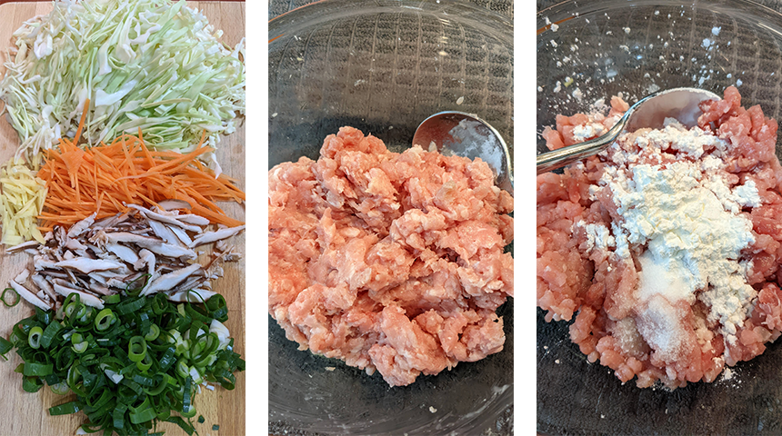 בינתיים מכינים את הירקות – חותכים לגפרורים ג'ינג'ר וגזר וקוצצים בצל ירוק. נפטרים מהרגליים של פטריות השיטאקי וחותכים לרצועות. חותכים לרצועות דקות גם את הכרוב.