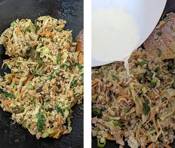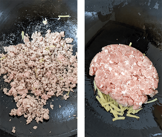 מכינים את המילוי – מחממים 2 כפות שמן בווק, מוסיפים ג'ינג'ר ומטגנים מעט. מוסיפים את הבשר המושרה ומטגנים עד שרוב הבשר משנה את צבעו ומוציאים לצלחת.